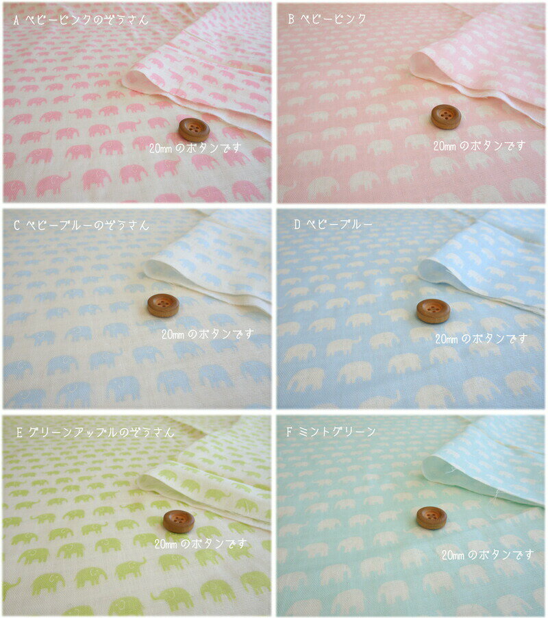 +++++++++++++++++++++++++++++++++++++++++++++ ふんわりダブルガーゼ生地にかわいい柄をプリントしました。 ミニミニサイズのぞうさんがいっぱい♪優しい色のベビーカラーで仕上げたとってもかわいい生地です。 手作りマスクやベビーグッズにおすすめの生地です。 +++++++++++++++++++++++++++++++++++++++++++++ ◎メール便対応は1mまでです。 ★生地巾 約108cm ★素材 コットン 100% ★☆オススメ作品は・・・・ イラストクリックでパターンのページにジャンプ! ●生地と一緒に糸はいかがですか? ★★ぴったりのミシン糸お選びいたします。★★ ☆☆ぴったりの手縫い糸お選びいたします。☆☆ 生地は30cm以上10cm単位でお買い求めいただけます。 たとえば、お買い上げ点数に『7』と入力された場合、『70cm』お買い上げになっていただいたことになります。お買い求めいただける最低単位が30cmですので、『3』以上をご入力ください。生地は30cm以上10cm単位でお買い求めいただけます。 たとえば、お買い上げ点数に『7』と入力された場合、『70cm』お買い上げになっていただいたことになります。 **お買い求めいただける最低単位が30cmですので、『3』以上をご入力ください。