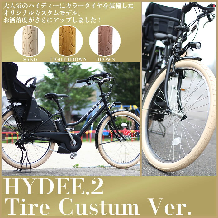 カラータイヤを装備したオリジナル限定モデル 品番 HY6C37 サイズ 26インチ(26×1.95インチセミスリックタイヤ) カラー クロツヤケシ(ツヤケシブラック) ホワイト ネイビー カーキ アクティブレッド 変速 内装3段変速付き ※シマノ製変速機 適正身長(目安) 約145cm? 3人乗り適正身長(目安) 約157cm? サドル最低地上高 74.5cm リヤチャイルドシート 乗車可能なお子様の目安:2才以上6才未満(個人差があります) 体重:22kg以下 身長:115cm以下 バッテリー 12.3Ahリチウムイオンバッテリー 走行距離(目安) 強モード:約44km 標準モード:約54km オートエコモードプラス:約62km ※坂道の多い地区での目安(参考数値)です 重量 約30.2kg 備考 ・加入無料3年間盗難補償付き(3年間盗難保険付き) ・BAAモデル ・幼児二人同乗基準適合車(3人乗り対応モデル/三人乗り対応モデル) ポイント 雑誌「VERY(ヴェリィ)」とのコラボで生まれた大人気の電動自転車「ハイディー2(HYDEE2)」です。 今回の「ハイディーツー(ハイディ2)」は、バッテリー容量が増え、長距離が走れるようになった大容量モデルとなりました。かっこいいデザインはそのままに、より便利でハイパワーなアシスト電動自転車になりました。 ・オートライト機能も搭載した「3ファンクションメーター」 ※残りアシスト走行可能距離表示、バックライト付き ・デザイン性と安全性を両立「デラックス後ろ子供乗せ装備」 ・専用前子供のせ取付可 ・チャイルドシートのベルト調整がよりやりやすくなった「スマートフィッター」 ・鍵穴の差込口が上向きになり、使いやすくなった新サークル錠「BSロック8SS」 ・アシストスイッチOFF時でも明るい点灯が可能「安心バッテリーライトシステム」 ・走行抵抗が少なく走りやすい「センタースリックタイヤ」 ・万が一の時にお子様の足を守る「大型フットガード」 ・手元レバーで簡単にハンドルロック。お子様の乗せ降ろしに便利「テモトデロック2」 ・1Wの明るい高輝度ホワイトLEDランプで夜道も明るい「ホワイトフラッシュミニ1Wバッテリーランプ」 ・軽く踏むだけで簡単に立ち上がり、倒れにくい「スーパーラクラクワイドスタンド」 ・チャイルドシートもしっかり固定「クラス27対応パイプキャリア」 ・しっかりとした制動力「シマノVブレーキ」(前) ・静かで確実・高性能「フィン付ローラーブレーキ」 ・錆びにくく丈夫「ステンレススポーク」 ・見やすい大型インジケーターを採用「グリップシフター」 ●自転車は全て完成車です。完全組み立て済みの状態でお届けしておりますのでご安心してご検討下さいませ ●ディスプレイの違いなどにより、多少色調が実物と異なる場合がありますので、ご了承下さい ●メーカー都合などにより、仕様、外観に変更がある場合がございますので、ご了承下さい ●乗車適応身長は目安です。手足の長さ、年齢、筋力等により乗車できない場合もございますので、ご了承下さい ●メーカー希望小売価格はメーカーカタログに基づいて掲載しています当店オリジナル限定モデル 2017年モデル HYDEE.2(ハイディーツー/ハイディー2) カラータイヤ仕様カスタムモデル ブリヂストンと雑誌「VERY」が共同開発した子供乗せ自転車「HYDEE2(ハイディ2/ハイディツー)」。 そのクールなデザインで発売以来大人気の自転車となっています。 こちらの商品のカスタムのご要望が多くなっており、最もご要望の多いタイヤカスタム仕様のモデルをご用意させていただきました。 タイヤを変更するだけで、ぐんとお洒落度がアップし、 また他の方とかぶらない、オリジナルのモデルとなります! 好みに合ったカラーをお選びいただけるよう、タイヤカラーは3種類ご用意させてもらっております。(今後ラインナップを増やしていく予定です) ・サンド(ベージュ) ・ブラウン ・ライトブラウン この機会に、自分だけのオリジナルモデルをお求めくださいませ! ※タイヤ交換作業は大変な手間が必要なため、通常納期よりも少しお時間が必要な場合がございます。 こちらのみ何卒ご理解をいただけますようお願い申し上げます。 ※他にこちらにもオリジナルカスタムモデルをご用意しております!