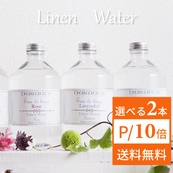 リネンウォーター 500ml 【選べる2本セット:ポイント10倍/送料無料/あす楽】 デュランス リネンウォーターは、エッセンシャルオイルを抽出した後に残る香りが凝縮された水です。 ヨーロッパでは、昔からこの水をアイロンのスチーム水として使ったり、洗濯のすすぎ段階に入れたりして衣料の香り付けに役立てていました。 アイロンをかける時に霧吹きでスプレーしたり、スチーム用の水の代わりに入れたりすればいつものお洗濯ものがとってもすてきな香りに包まれます。洗濯のすすぎの最後に入れるとほのかに残る香りをお楽しみいただけます。また、クッション、枕など、ルームフレッシュナーとしてもお使いいただけます。 容量:500ml ■□■生産国:フランス -香りは8種類- カネルオランジュ...甘くスパイシーな香り ジャスミン...優雅で甘美なフローラル系の香り ラベンダー...安らぎを誘うラベンダーの香り ローズ...華やかなローズの香り ライムブラッサム(ティヨール)...さわやかなライムの花の香り バニラ...甘く優しいバニラの香り フラワーオレンジ...やわらかで優しいオレンジの花の香り コットンフラワー...清潔感のある爽やかでやさしい香り -使い方- ●アイロンをかけるときに霧吹きとして ●スチーム用の水代わりとしてそのまま薄めずに 直接アイロンに入れて使います。 ●洗濯の際、すすぎの最終の時に約50cc入れると洗濯物にほのかな香りがの残ります。 ●カーテンやクッションなどに霧吹きでルームリフレッシュナーとして使用します。 ※ボトルにスプレー(ディスペンサー)は付属しておりません。ご注意下さい。 レビュー:158件 レビュー:52件 レビュー:253件 対象ジャンル:芳香剤・フレグランス(その他) / 集計期間:週間ランキング / 2016年4月22日(金)更新 (集計日:4月11日?4月17日) 》 リネンウォーター単品は、こちらから