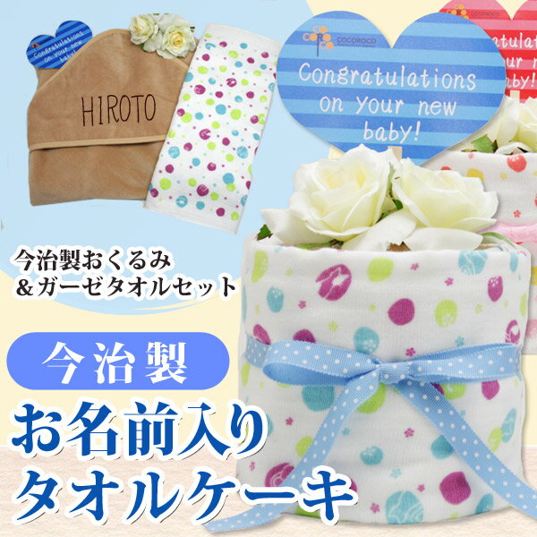 出産祝い 名入れ 名前入り プレゼント 男の子 女の子 タオルケーキ 名入れ無料 最短2営業日でお届け可能!名入れデザイン無料&ラッピング無料お名前をプリントした今治タオル生地の名前入りおくるみ(アフガン)を、ガーゼタオルで包んでタオルケーキを作ります♪もちろんガーゼタオルも国産今治製!どちらも吸水性が高く肌触りもなめらかな、赤ちゃんの肌にも優しい綿100%で使い勝手も上質です。おくるみには★「お名前」「お誕生日」「出生時間」「出生体重」「出生身長」★を入れることができます。名前を「漢字」や「ひらがな」にしたり「お誕生日」の欄にコメントを入れたりアイデア次第で色々できちゃいます♪★お子様のお名前とデザインが合体★ココロコではデザイナーが商品のプリント前に文字のバランスを調整して、刺繍ではなく元々の絵柄デザインに名前を入れます!既製品に刺繍で名前だけを入れる商品はよく見かけますがデザイン自体に名前を入れて一からセミオーダーで作る一点ものの名入れアイテムは★世界でたった一つだけの贈り物★二人目三人目の出産祝いでも他とかぶらないお祝いとして喜ばれています。タオルケーキには「おめでとう」の意味を込めたハートのカードが付属します♪タオルケーキの内容:今治製ガーゼフェイスタオル1枚今治製名前入りおくるみ(アフガン)1枚ラッピング&配送用ギフトBOX■ Item Specサイズガーゼフェイスタオル:約82cm×34cmおくるみ(アフガン):約70cm×70cm素材綿100% 安心の国産。国内有数の日本製タオル生産地、愛媛県今治(いまばり)市製。おもな用途出産祝い配送についてのご注意熨斗(のし)対応致します出産祝いの熨斗をご希望の場合は備考欄へご記入くださいプリント前イメージ確認についてプリント前イメージの確認を希望の方は、約3営業日でメールにてデザイン画像をお知らせします。もしここで名入れ情報の変更がある場合は無料で修正します。■ご注意 イメージ確認「する」を選択された場合「イメージ画像を確認し、制作OKのお返事」を頂くまで実物の商品制作はいたしません。当店からのメールは必ずご確認ください。※デザインの変更は別途有料カスタマイズをご案内します。お気軽にお問い合わせください。 ※こちらの「タオルケーキ」は「おむつケーキ」とは異なりますので、おむつは商品に含まれません。ご注意ください。 (おむつケーキをお探しの方はこちら⇒【ココロコの名入れおむつケーキ】)