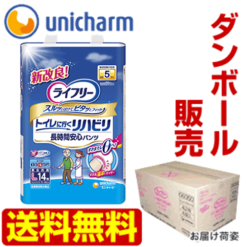■ライフリー リハビリパンツ L14枚 [ダンボール販売セール(1箱4袋セット)] 商品特長 ライフリー リハビリパンツ「スルッとはけて、ピタッとフィット」 介助があれば立てる方のための、長時間モレずに安心で上げ下げしやすい、排泄リハビリに最適なな紙パンツです。 ・新改良 特許技術 足ぐりにふんわりフィットする「すきまピタッとギャザー」がすきまモレを低減。 ・新改良 特許技術 ギャザー間が広い「パッドすっぽりポケット」でパッド交換が簡単。 ・特許技術 おしりに引っかからない「スルっとゾーン」がウエストゴムの巻き込みを防止。 ・特許技術 「足入れスムーズ」によりすっきり形状で足の指がひっかからない。 ・「やわらかストレッチゾーン」が軽い力で2倍に広がる。 ・「しっかりフィットゾーン」がズレを防ぐ。 ・「スーパーロング吸収体」でたっぷり5回吸収。 ・全面通気シートで、ムレずにサラサラ。 ・やわらか素材でここちよい肌触り。 ・Ag+配合、パワー消臭トリプル効果※ ※アンモニア・硫化水素・ジメチルアシンについても消臭効果があります 袋入数 4袋(56枚) 吸収量 おしっこ約5回分 (約750cc) サイズ Lサイズ 75?100cm 関連情報 楽天シニア市場 大人用 紙おむつ 紙オムツ 在宅介護 パンツ レギュラー 長時間 リハビリ ユニ・チャームいきいき生活(ユニチャーム)