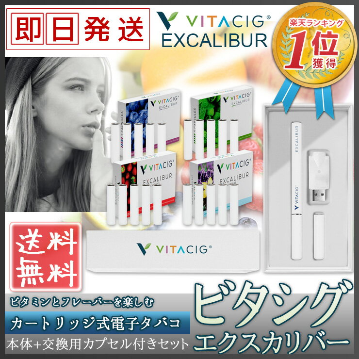 ■天然成分とビタミンだけを含むピュアでクリアな蒸気を吸うことができます。 ■ニコチンやタールなど体に害のある成分は含んでいません。 ■高級なデザインで不快な臭いはなくビタミンとフレーバーを楽しむことができます。 【商品名】 ビタシグ エクスカリバー (VITACIG EXCALIBUR) 本体+交換カートリッジ セット 【商品説明】 ビタシグからカートリッジ式のビタシグエクルカリバーが新登場!吸い終わってもカプセルを交換する事により繰り返し使用出来ます。 平均充電時間:2.5時間 各カプセルは300〜400回の吸引が出来ます。 <セット内容> ・ビタシグ エクスカリバー本体 ×1 ・充電用USBアダプター ×1 ・ボイステラスベリー カプセル ×1 ・マーベラスミント カプセル ×1 ・交換用カプセル 5本入(4フレーバーより選択下さい) カプセルには以下のビタミンベースが含まれています ビタミンA:1IU ビタミンB1:100mcg ビタミンC:100mcg ビタミンE:100mcg コエンザイムQ10:4 mg