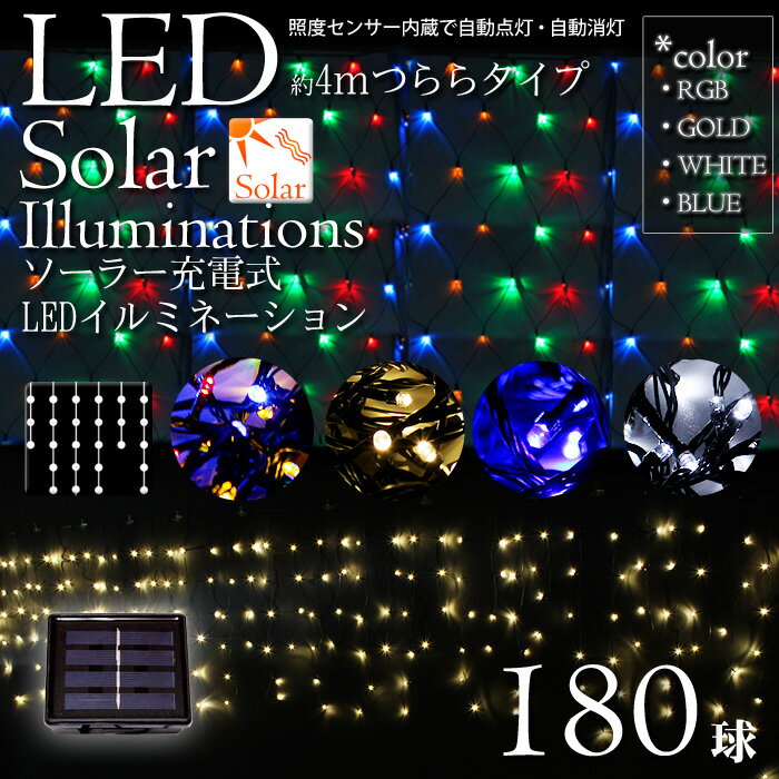 ソーラー充電式LEDイルミネーション【180球】 光センサー内蔵で自動ON/OFF切替 つららタイプでガーデンイルミネーションに最適 ソーラーパネルで発電。更に内臓電池に充電できるので省エネ。 今の時代に最適なエコ商品!! カラーはカラフル/ホワイト/ブルー/ゴールド。 ソーラーパネル部分に光センサーが内蔵されているので 辺りが暗くなると自動でON。明るくなるとOFFする『かしこい』アイテム 電源配線が要らないのでLEDを飾り付け、ソーラーパネルをお日様が良く当たるところへ設置していただくだけで簡単にご使用いただけます。 ■点灯or点滅切替可能■ ON/OFFスイッチで常時点灯or点滅の選択が可能 ■光センサー内臓■ 暗くなるとセンサーが働き、充電した電気で点灯させます。 明るくなると、センサーが働き自動的に消灯します。 お庭の柵に、ラティスやベランダに! クリスマスイルミネーションにピッタリです! ソーラーパネル本体材質:ABS樹脂(パネル部分は含みません) 支柱:約17cm 全長:約4m LED間隔:約10cm フル充電点灯目安:夏季8時間・冬季6時間 本体背面に、スイッチが付いています。 ・ON/OFFスイッチ(兼パターン選択) ※LEDの照度はソーラーバッテリーから遠くなる程、低下しますがこれは製品上の特性となります。 ※ソーラーパネルの泥汚れ、水垢などは発電を低下させるので、 こまめにキズが付かないよう拭きとって下さい。 ※製品を長くご使用いただく為にも、追加防水処理をして頂く事をおススメします。 ※製品を長くご使用いただく為にも、追加防水処理をして頂く事をおススメします。 ※新品ですが、輸入品のため稀に汚れや傷等がある場合がございますが、ご了承下さい。 ※外観及び仕様は予告なく変更になる場合もございます。 ※取付前に必ず動作確認を行なってください。動作確認を行わずに取付された場合保証対象外となる可能性があります。 ※弊社は取付に関してのサポートは行っておりません。 ※取付は自己責任にて行ってください。 ※製品の初期不良に関して、商品到着より1週間程度であれば交換などの対応をさせていただきますが、その他工賃等の製品以外に発生したいかなる費用も一切保証出来ません。ご理解とご了承の上何卒宜しくお願いいたします。 不正注文ログイン、クレジットカードの不正利用のご注文に関しまして ※本人なりすましによる代金引換での不正注文が多発しているとの報告があります。 楽天ポイント不正獲得目的の注文増加の報告を受け 不正注文を抑制するために以下の対策をとらせて頂いております。 なりすまし注文、いたずら注文、楽天ポイント不正獲得目的等の対応 料金未払い・代引き受け取り拒否などへの対応について 【お電話やメールでの連絡が取れない場合に関して】 入金が確認できない・代引きで受け取り拒否行為が確定した場合は、費用の全額を請求させていただきます。 ※期限後15日の猶予期間経過時点で不正とみなします。 (本来の注文代金のみのご請求。梱包代等は請求致しません。) ◎請求内容:商品代金+運賃+代引手数料 ※請求につきましては、内容証明郵便にて送付いたします。 ■上記につきまして、期限内の対応が無い場合「悪質注文」とみなします。 弊社所在地を管轄する簡易裁判所にて法的手続きを行ないます。 以降は裁判所の指示に従ってください。